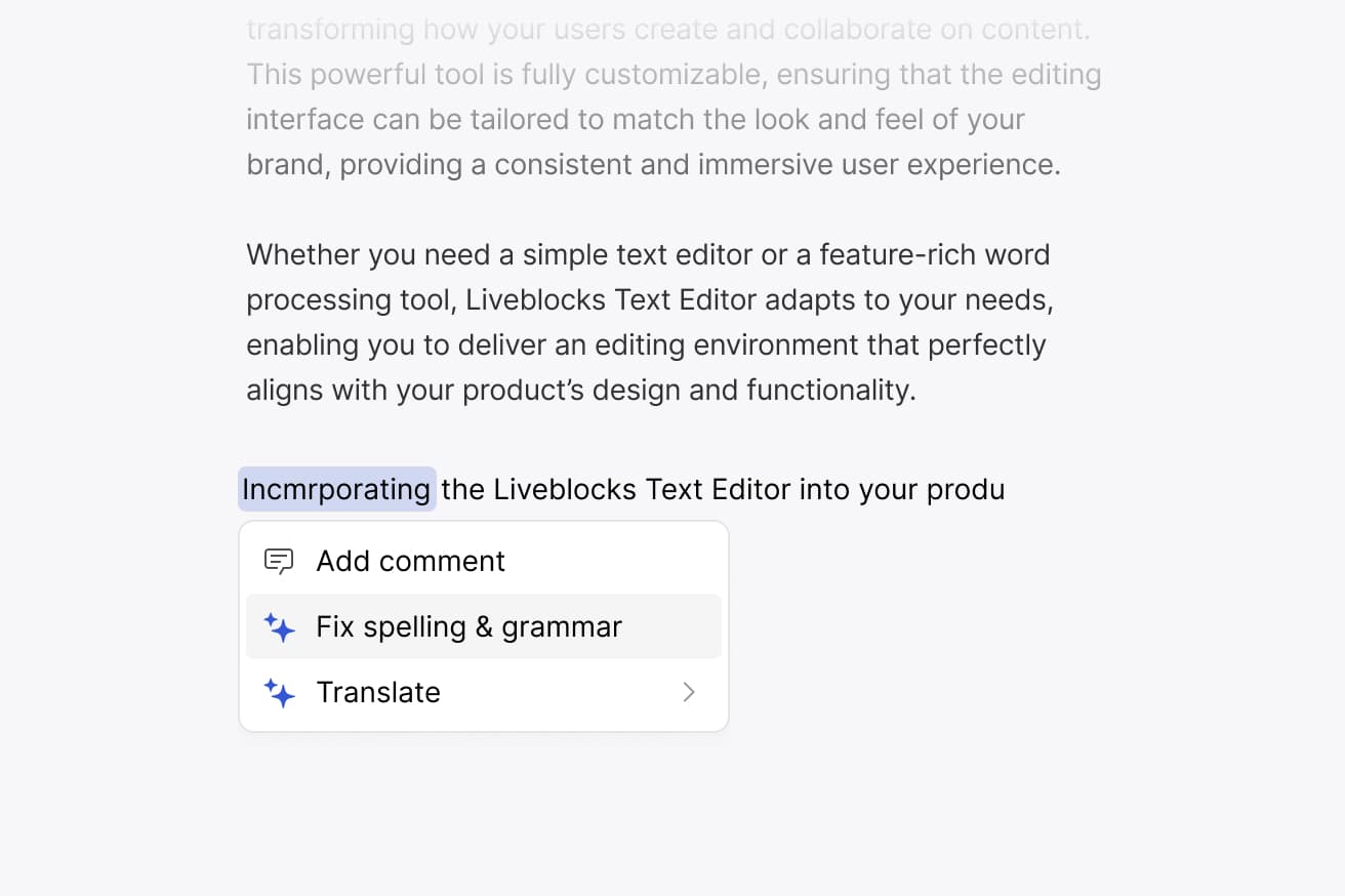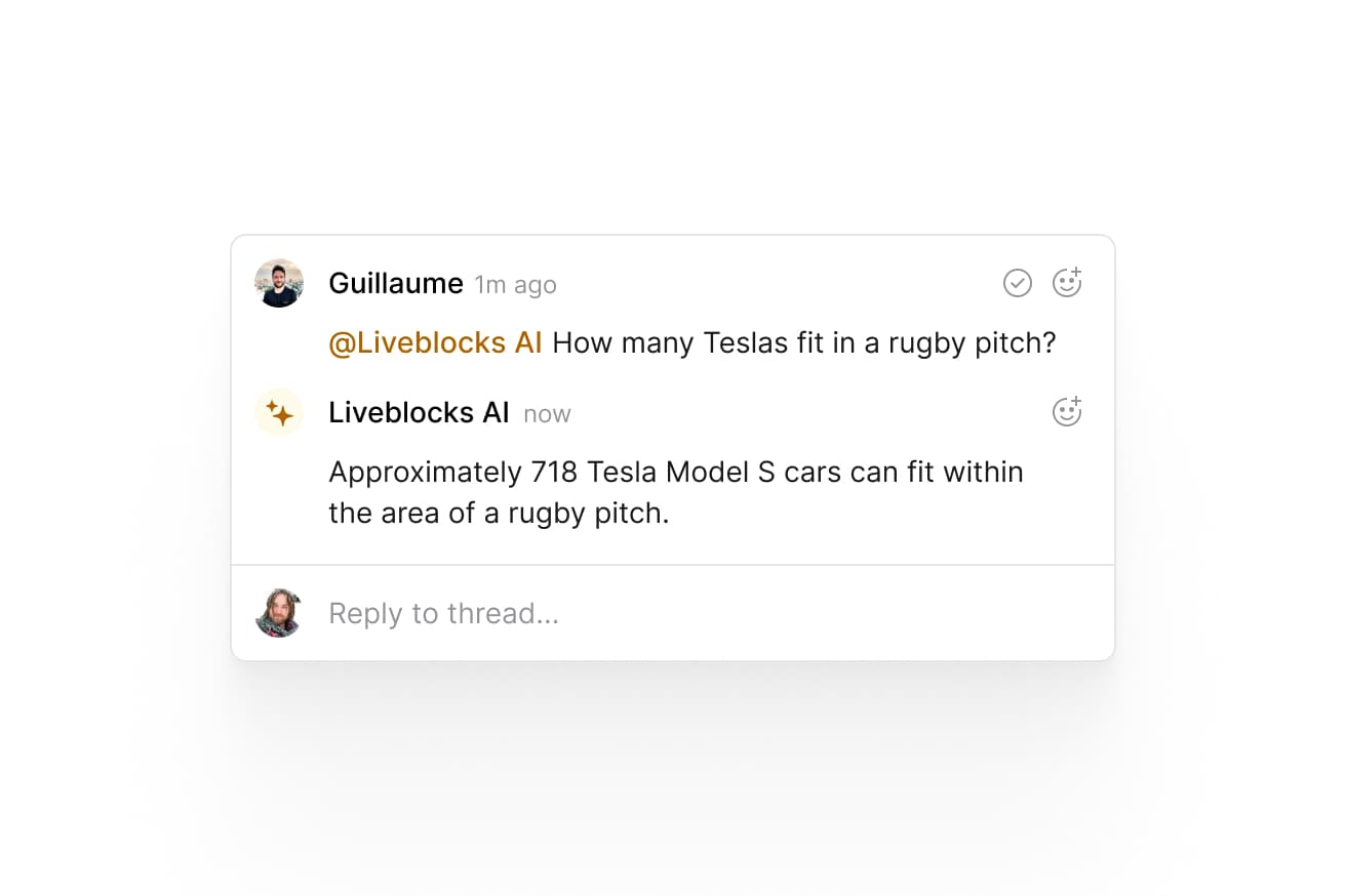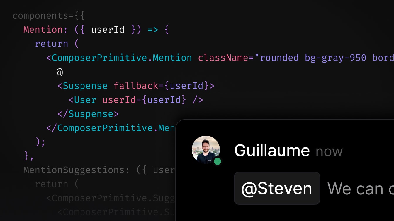 To start things off, we’re introducing a brand new beta product: Liveblocks Text Editor. It enables you to add table stakes collaborative features like mentions, comments, notifications, and AI to your text editor with just a few lines of code.