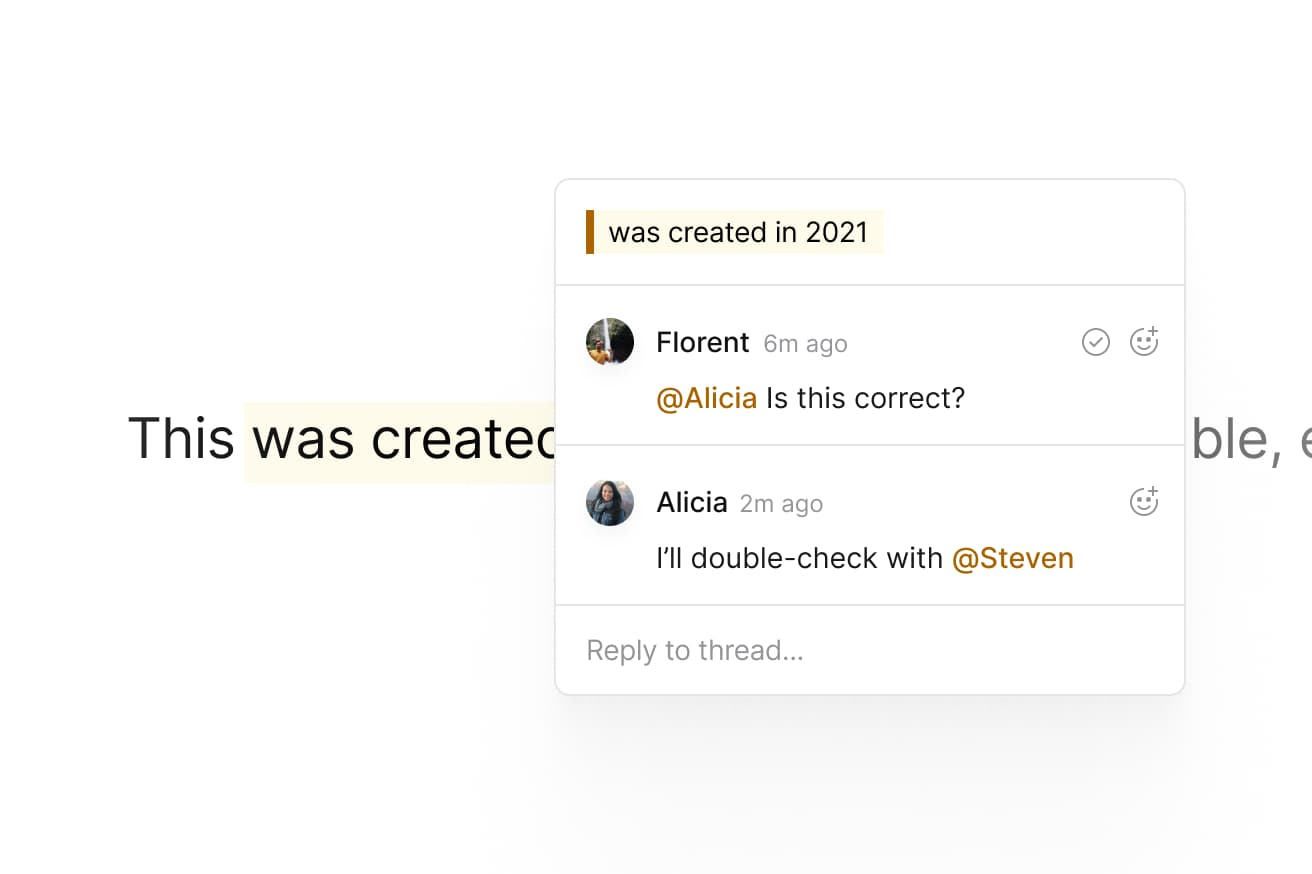 Our goal with Liveblocks Text Editor is to enhance existing text editor frameworks through dedicated integrations that make it trivial to add all the table stakes collaborative features you use and love every day in tools like Notion, Linear, and Google Docs:
