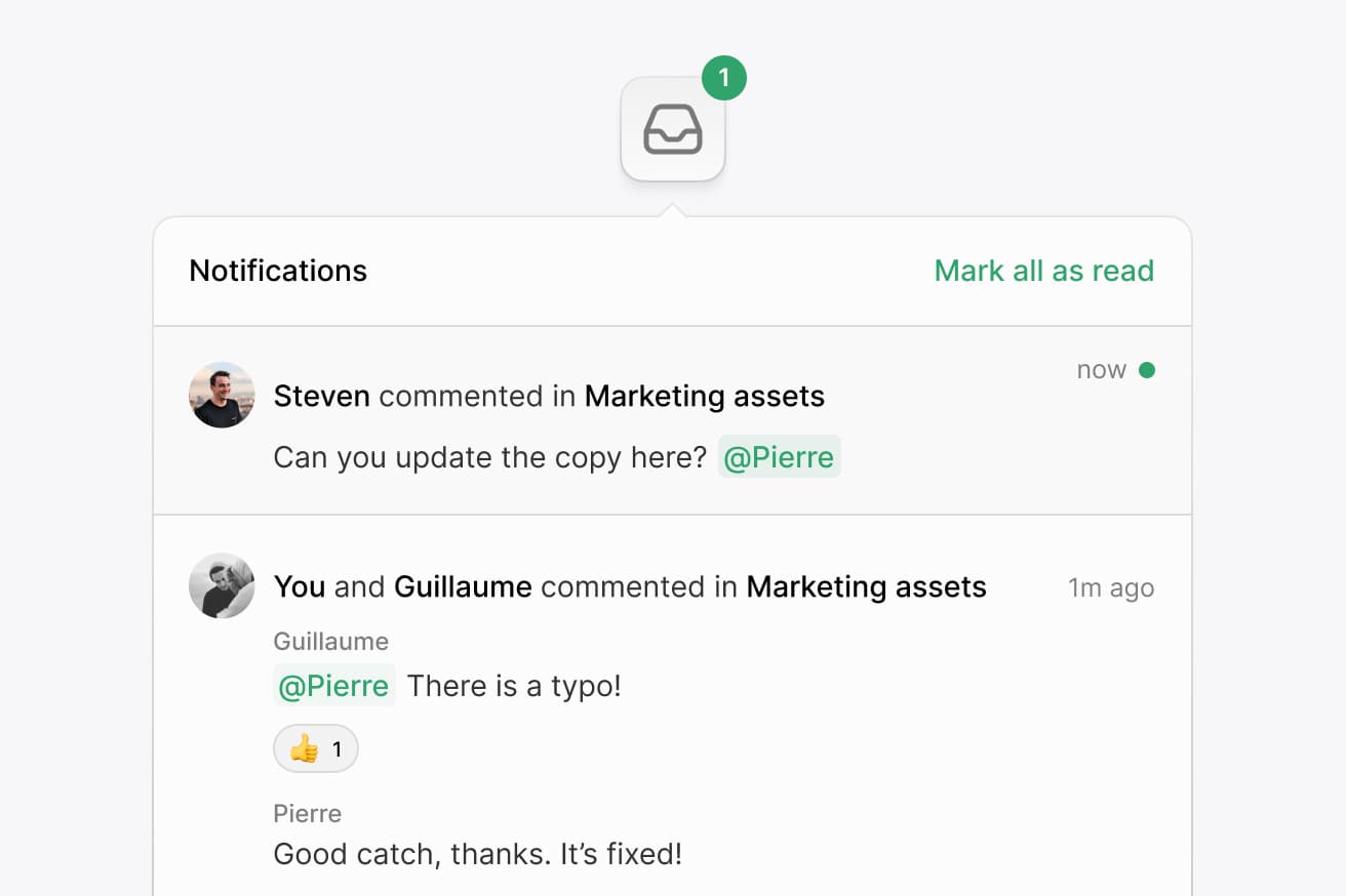 Liveblocks Notifications are special because they’re crafted to match the UX patterns world‑class companies like Figma, Notion, and Linear spent years optimizing. This means you can focus on your own product, not building, scaling, and optimizing notifications. What’s nice is that it seamlessly integrates with Liveblocks Comments, meaning that people will automatically receive a notification when they’re mentioned in a thread. And if you’d like, you can send custom notifications as well.