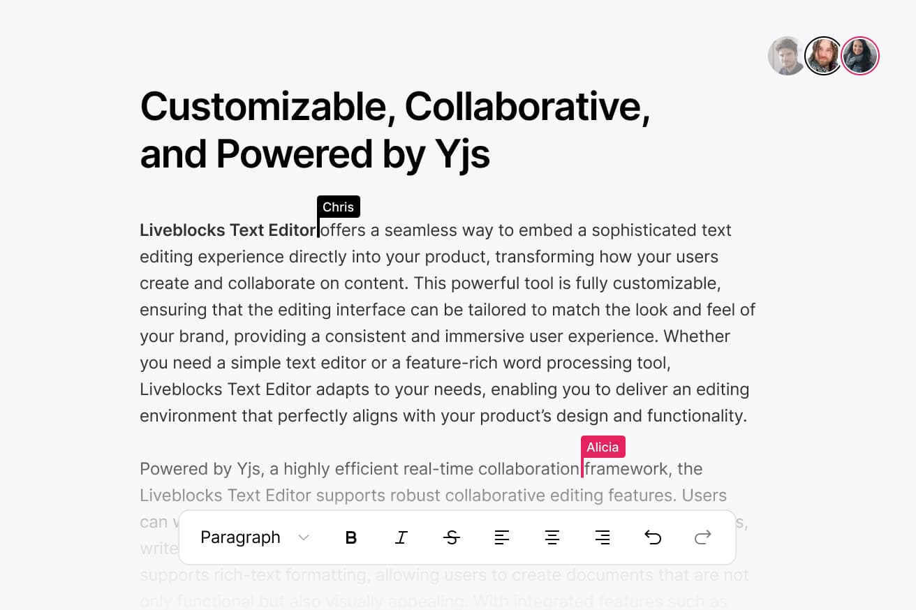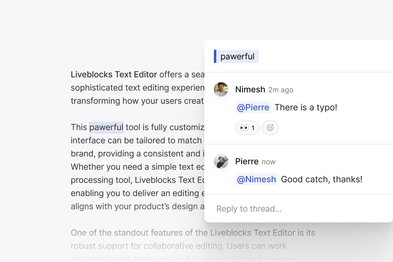 - Liveblocks Text Editor: all the collaborative features embedded in your editor.