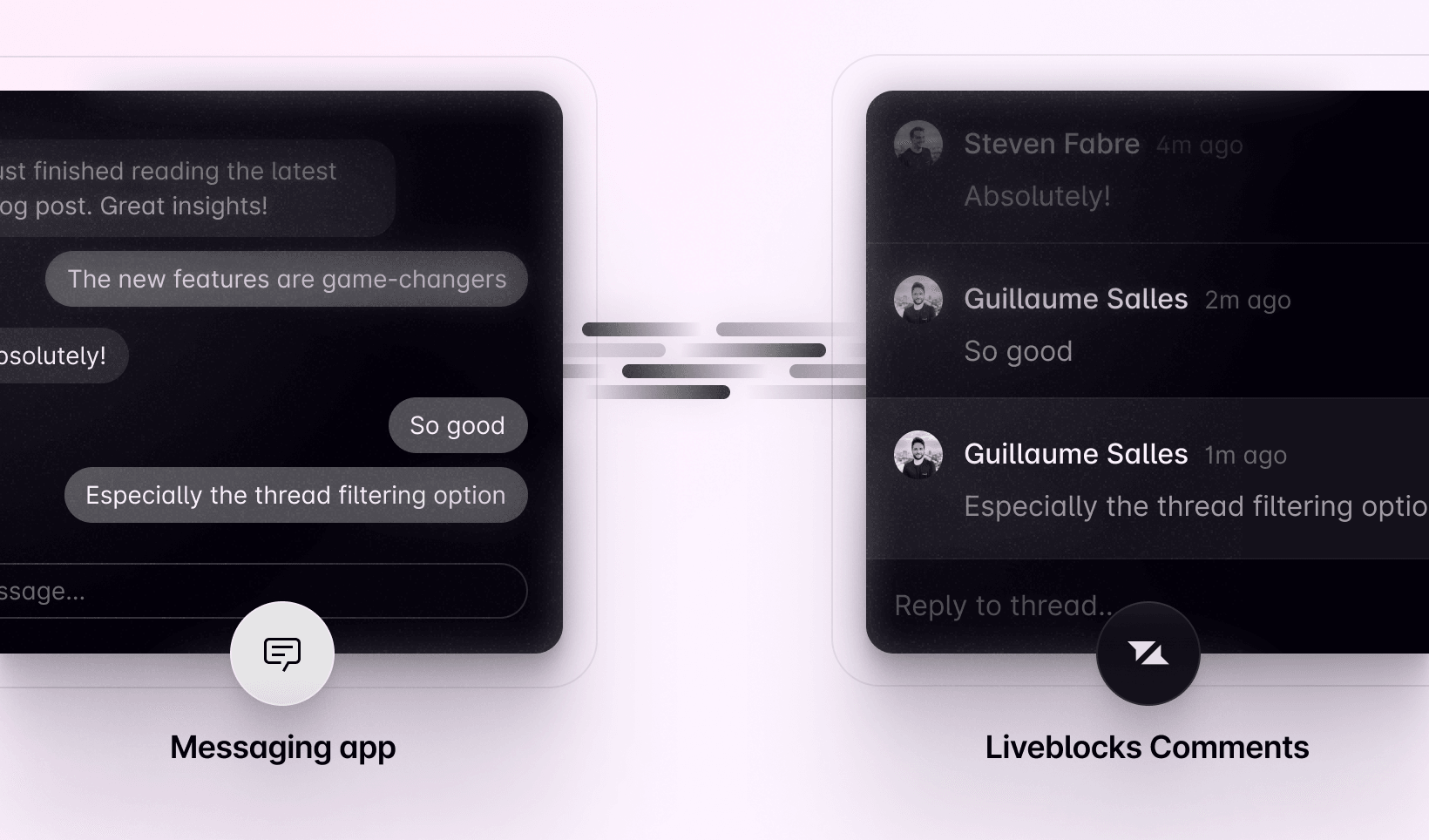 With Liveblocks 1.9, we’re updating Comments, introducing a way to programmatically create and modify threads, comments, and reactions. This enables a number of different use cases such as AI agents, moderation, and two-way synchronization with messaging apps. We’re also adding a way to filter threads by metadata.