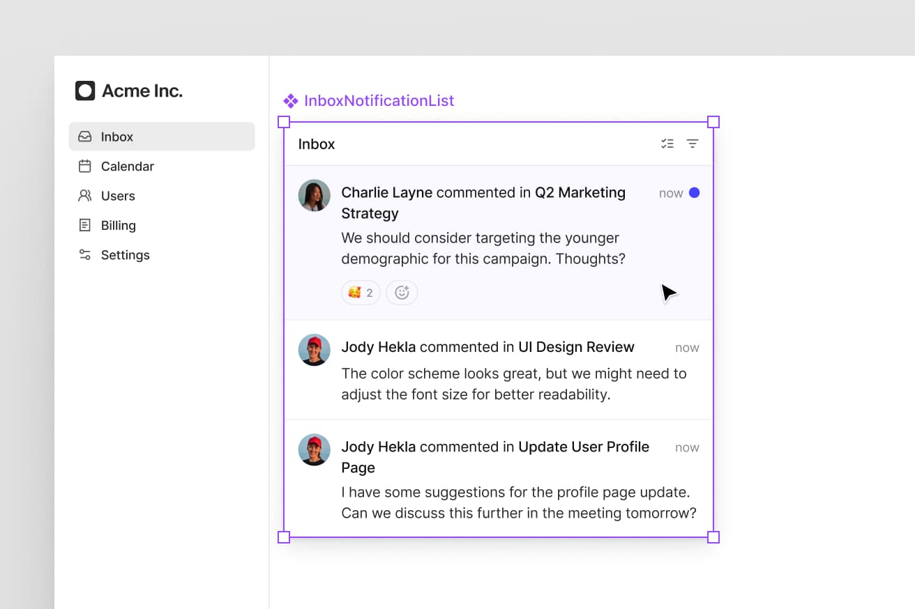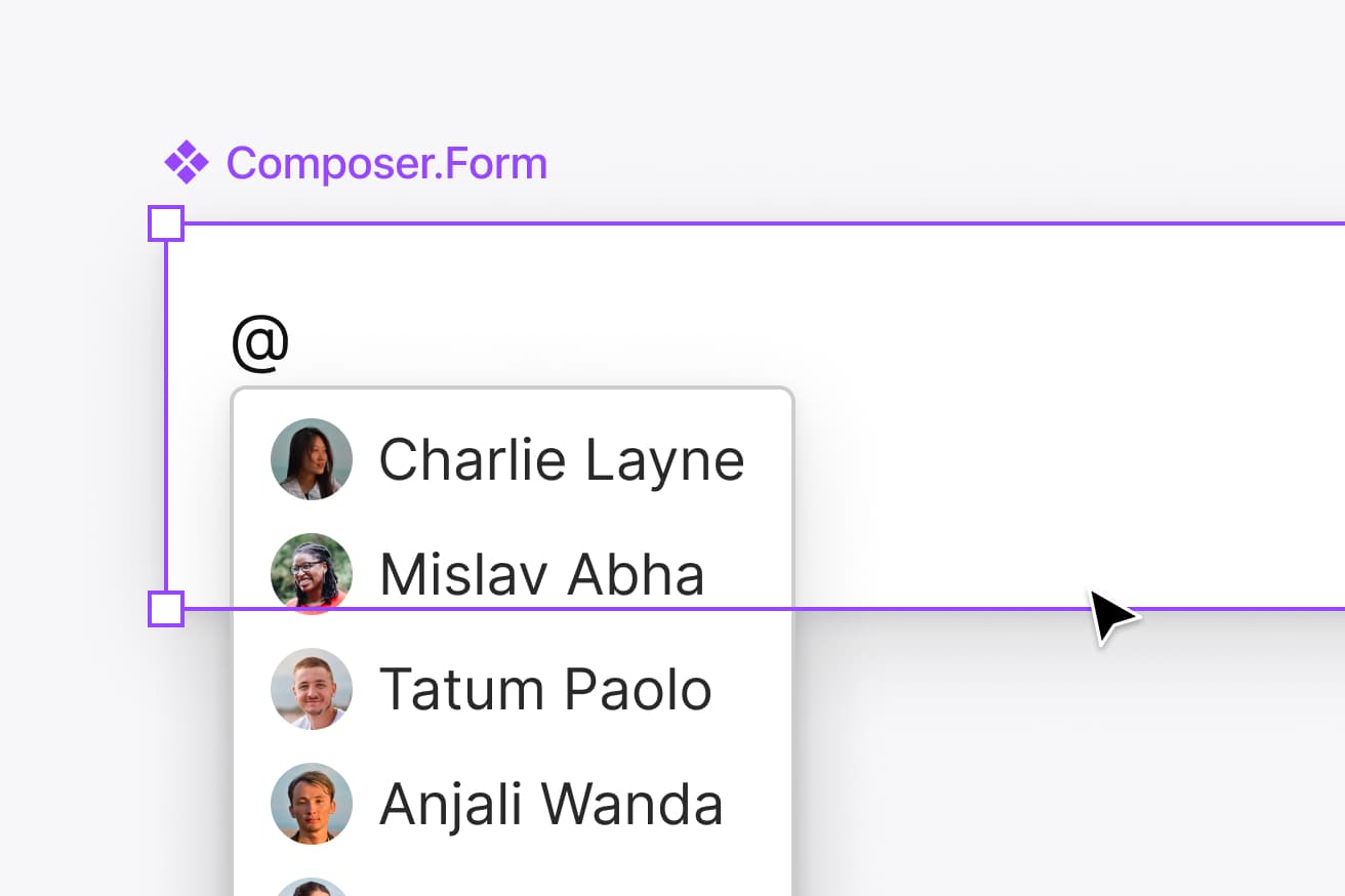 Each UI element in the Figma kit perfectly matches a coded pre-built component offered in the Liveblocks React UI library. This enables engineers on your team to bring your design to production in a matter of hours.